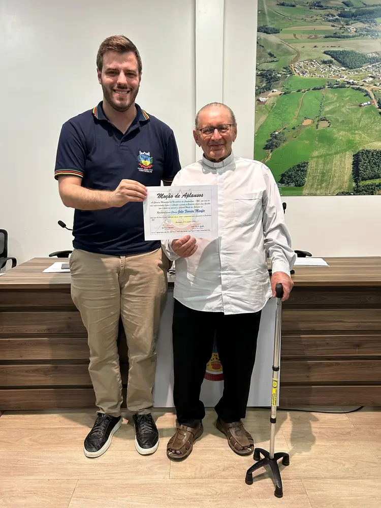 Na manhã desta segunda, foi entregue a 1ª Moção de Aplauso da história da Casa ao Padre João Ferrari Manfio, pelos seus 90 anos de vida e 35 anos de sacerdócio dedicados ao nosso município.A homenagem, proposta pelo vereador André Zanella e aprovada por unanimidade, reconhece a trajetória de fé, aco